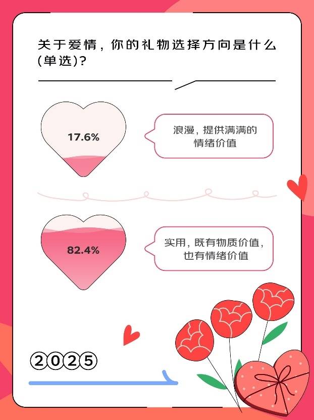 实用型礼物更受欢迎★。调研显示,82.4%的人关注礼物的实用价值,情绪价值在实用价值基础之上更让人快乐★。