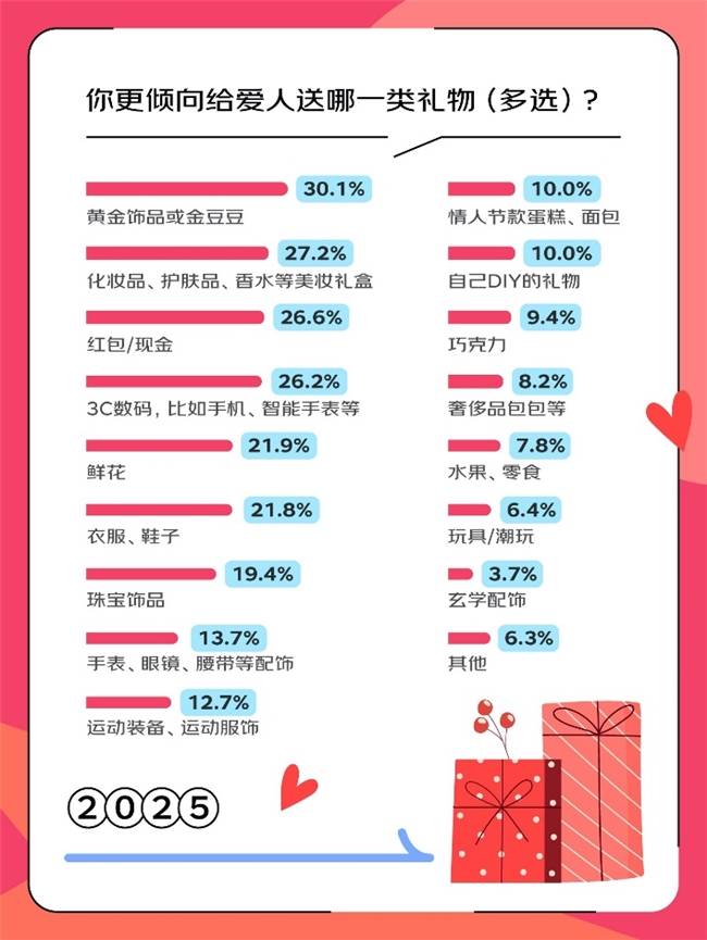 从送礼选择来看,黄金饰品、美妆礼盒、红包是礼物TOP3的热门选择,3C数码产品紧随其后,手机★、智能手表等3C数码成为实用型礼物的选择之一,精明的年轻人表示★,今年国家补贴范围拓展至更多3C品类★,有国补补贴的礼物真香。美妆礼盒也是送礼的热门选择之一★,值得注意的是,近五成年轻人很关注美妆礼盒的性价比。