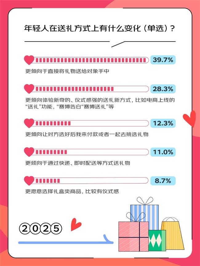 线上送礼功能的出现满足了年轻人通过自己的创意加强仪式感的需求。调研显示,电子贺卡自定义封面功能和AI祝福语被网友点赞,42.7%的人认为这样的功能加持了仪式感,32%的人觉得让社交送礼场景不再局限于单纯的资金转账,玩法更多样、体验更新奇★,26.3%的人表示送礼功能节省了传统送礼场景中询问地址★、喜好等较为繁琐的环节。此外★,京东快递省时省力、产品丰富度高和质量更有保障★,也让线上送礼更加安心、放心。