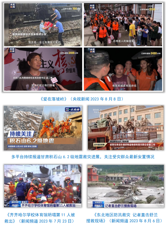 在京津冀和东北地区极端降雨、甘肃积石山6.2级地震、宁夏烧烤店燃气爆炸★、山西煤矿办公楼火灾、黑龙江齐齐哈尔体育馆坍塌等灾害和事故报道中★,及时跟进救灾救援和群众安置等最新情况,第一时间回应社会关切。