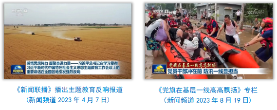 高质量高标准做好主题教育报道。《新闻联播》《新闻和报纸摘要》《全国新闻联播》等视音频重点栏目推出《学习贯彻习新时代中国特色社会主义思想主题教育》《学思想 强党性 重实践 建新功》《党旗在基层一线高高飘扬》等专栏★,全程展示各地各部门主题教育活动特色★、典型做法和进展成效。
