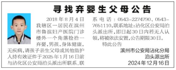 2024年12月16日★,滨州市公安局沾化分局泊头派出所通过滨州日报发布《寻找弃婴生父母公告》: